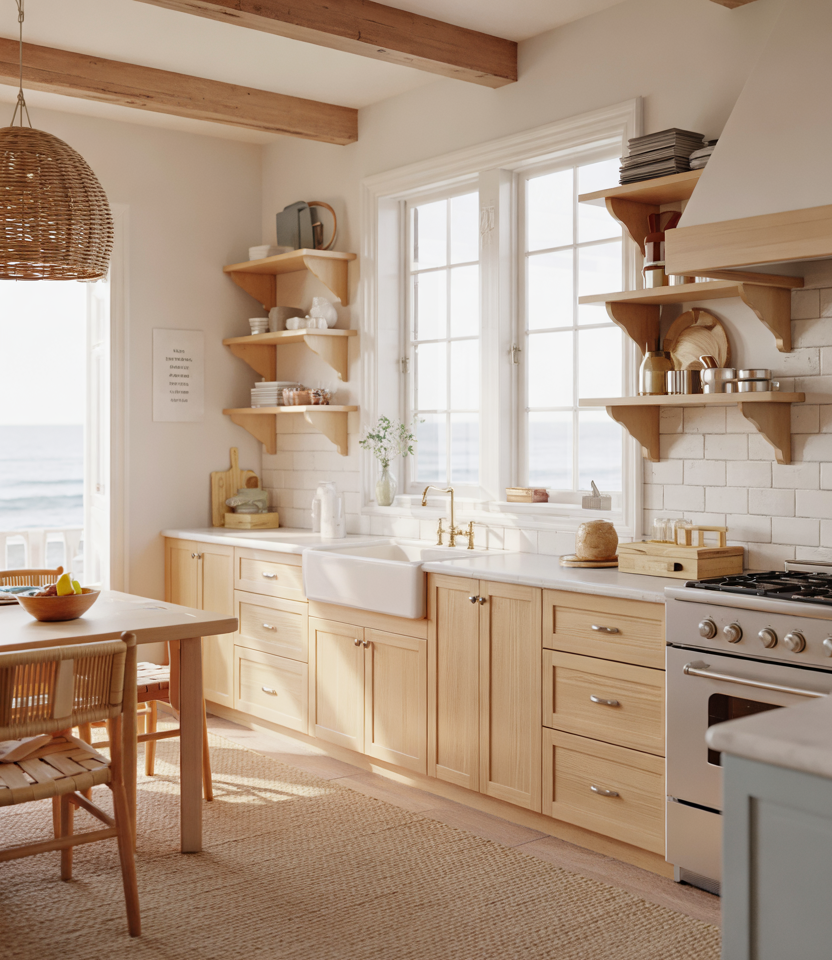 White oak works beautifully in breezy kitchens where a soft, airy mood is the goal. Pairing it with gentle light tones, coastal-inspired color schemes, and simple hardware ideas helps the cabinetry feel effortless and calm—perfect for coastal or lakefront homes seeking understated warmth.