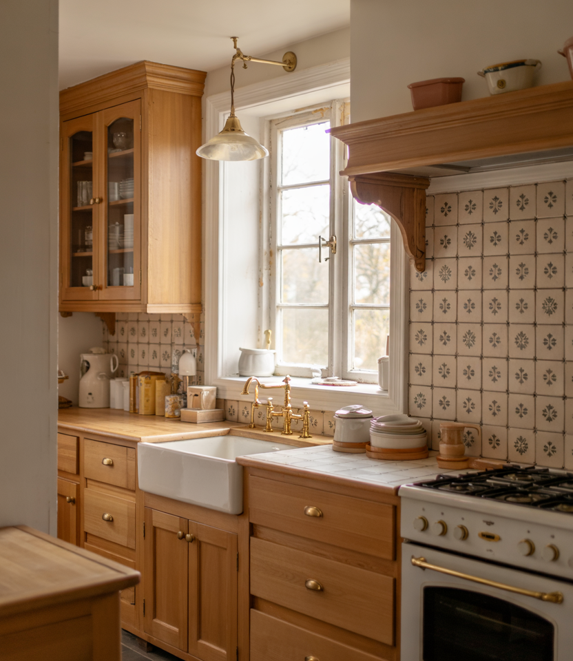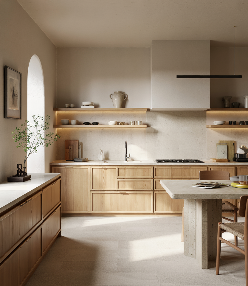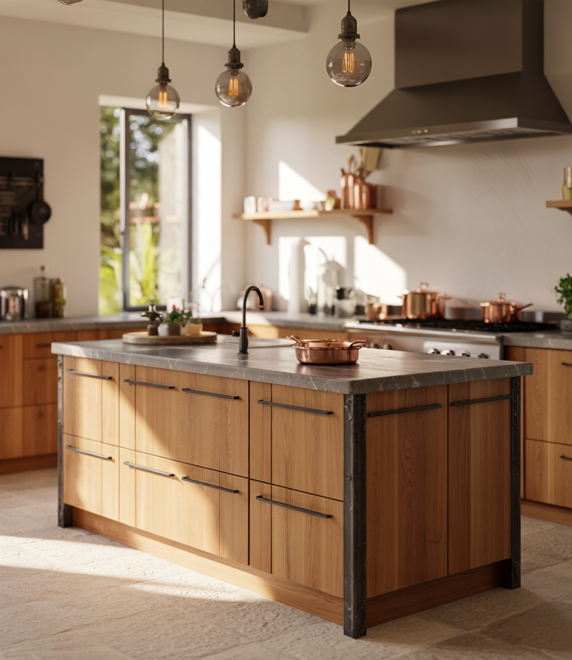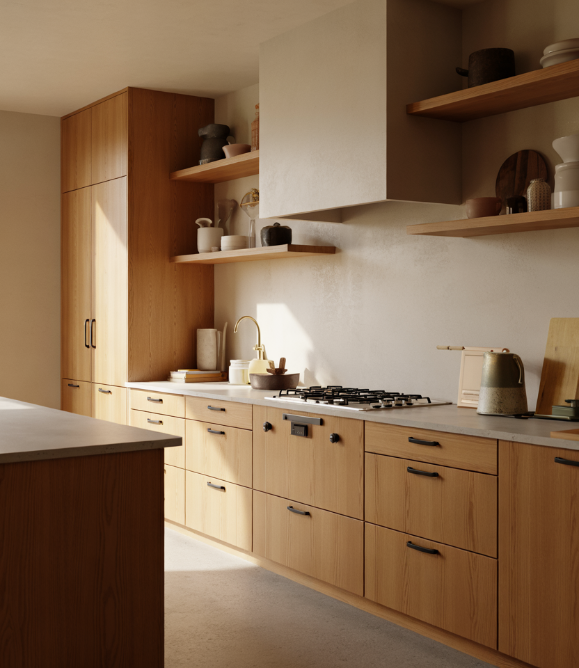 The combination of oak warmth with gentle cool tones feels especially current. Pairing a soft grey floor, slim hardware ideas, and a balanced natural finish on cabinets produces a welcoming kitchen that feels fresh but not trendy.