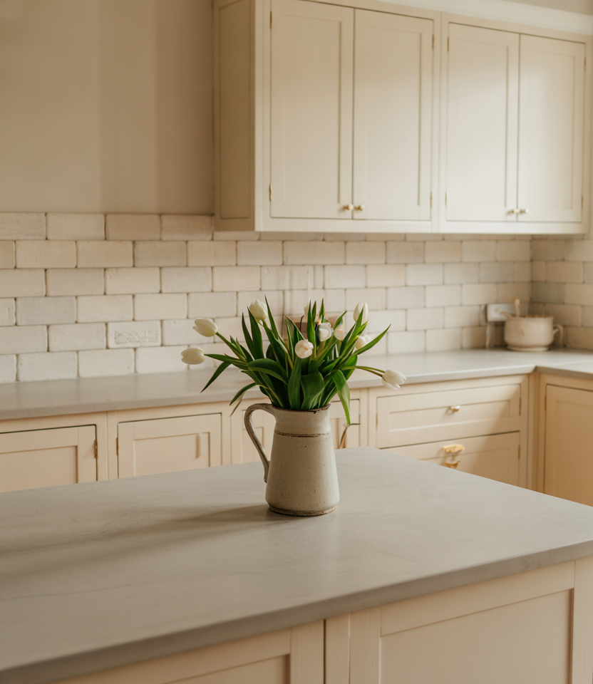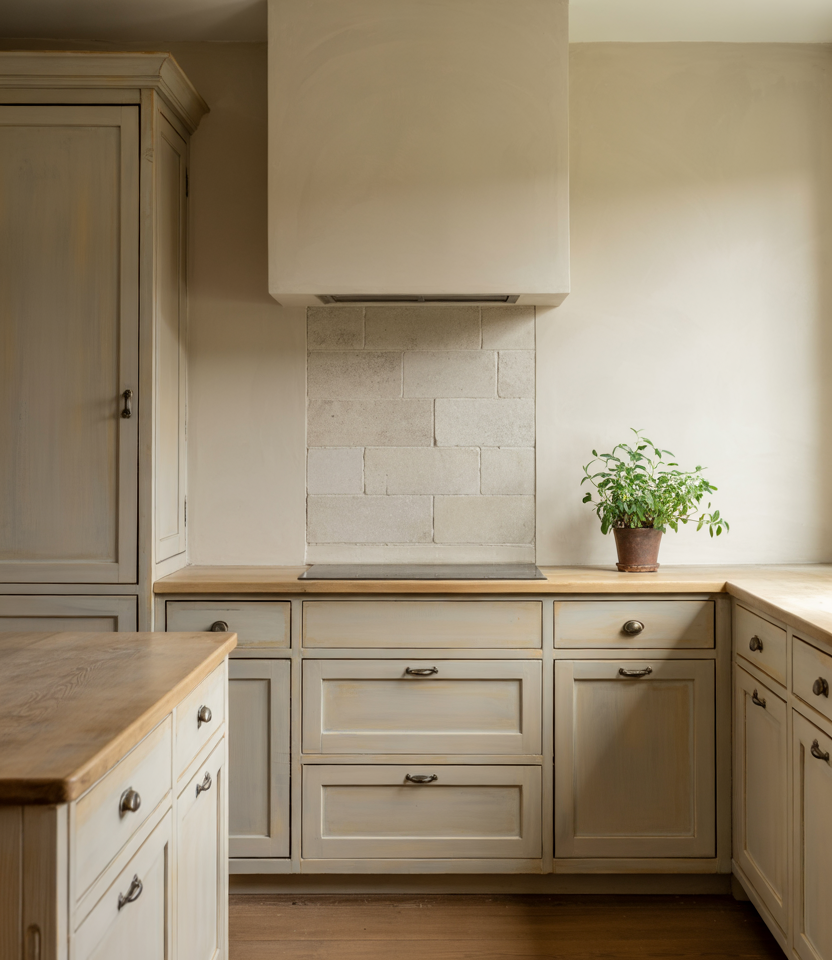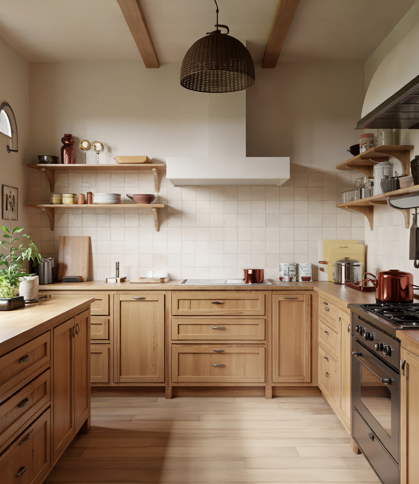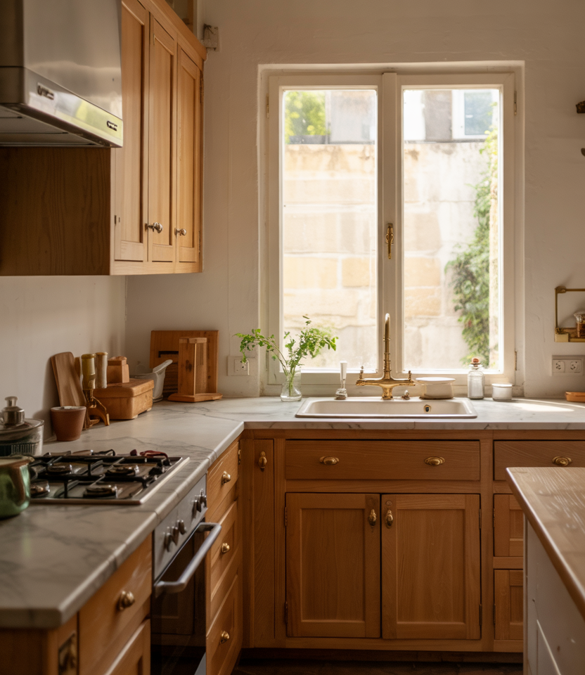 The combination of oak warmth with gentle cool tones feels especially current. Pairing a soft grey floor, slim hardware ideas, and a balanced natural finish on cabinets produces a welcoming kitchen that feels fresh but not trendy.
