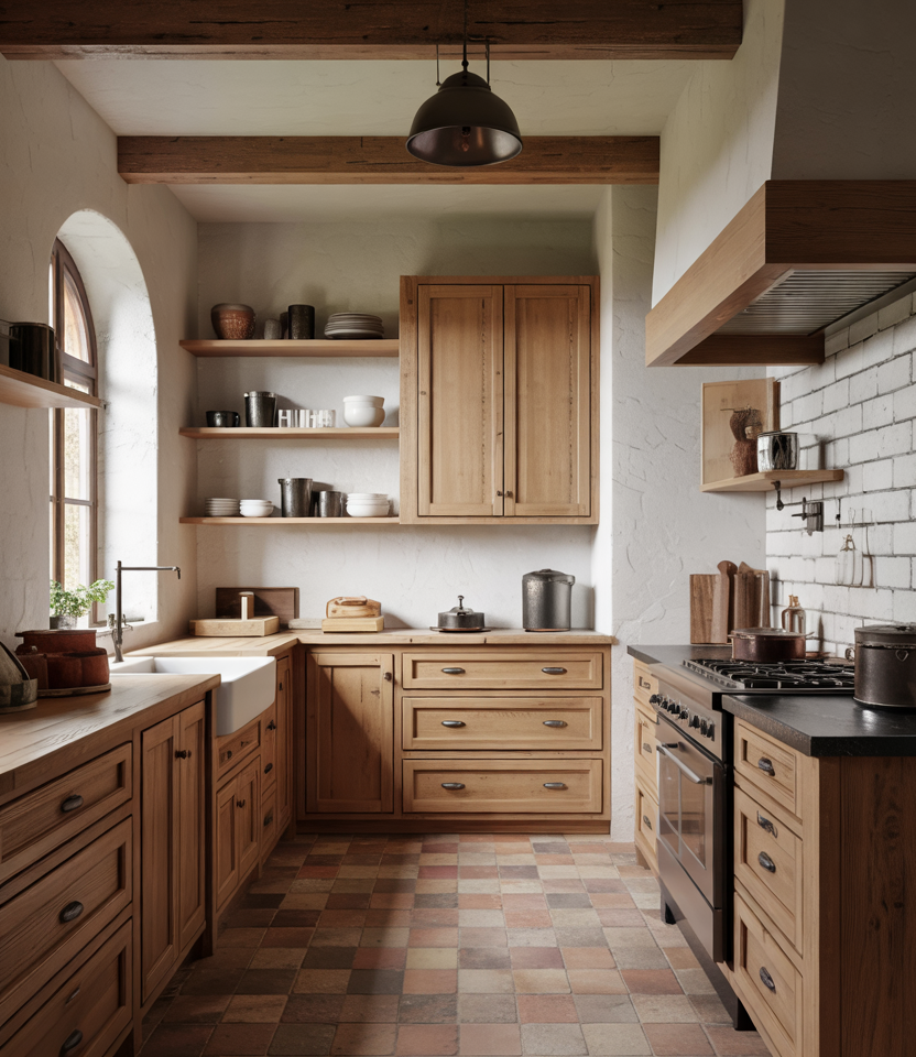 If you’re aiming for a modern farmhouse aesthetic, a slightly rustic oak grain paired with rich dark counters and matte black hardware brings a grounded charm. Incorporating touches of terracotta floor warmth keeps the space honest and welcoming.