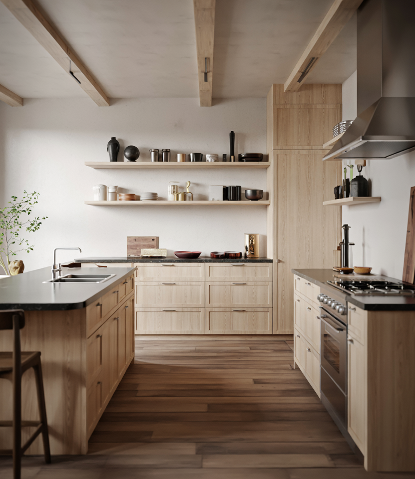 A refined modern kitchen comes to life when oak’s grain is the star. Using a slim shaker profile, paired with balanced color schemes, soft light tones, and a subtle touch of style inspiration from minimalist design, gives Oak a polished, gallery-like presence.