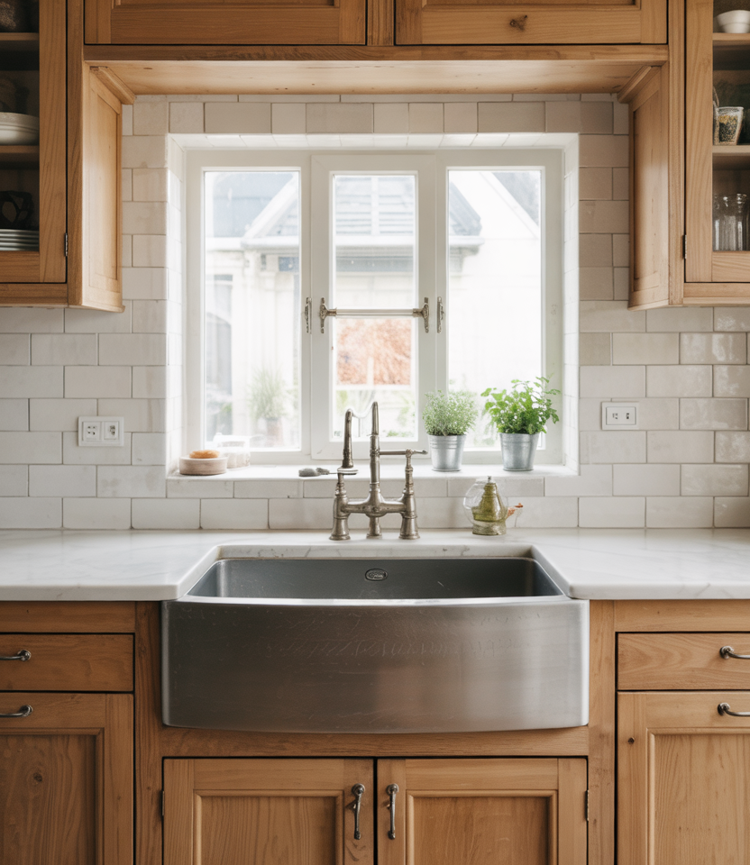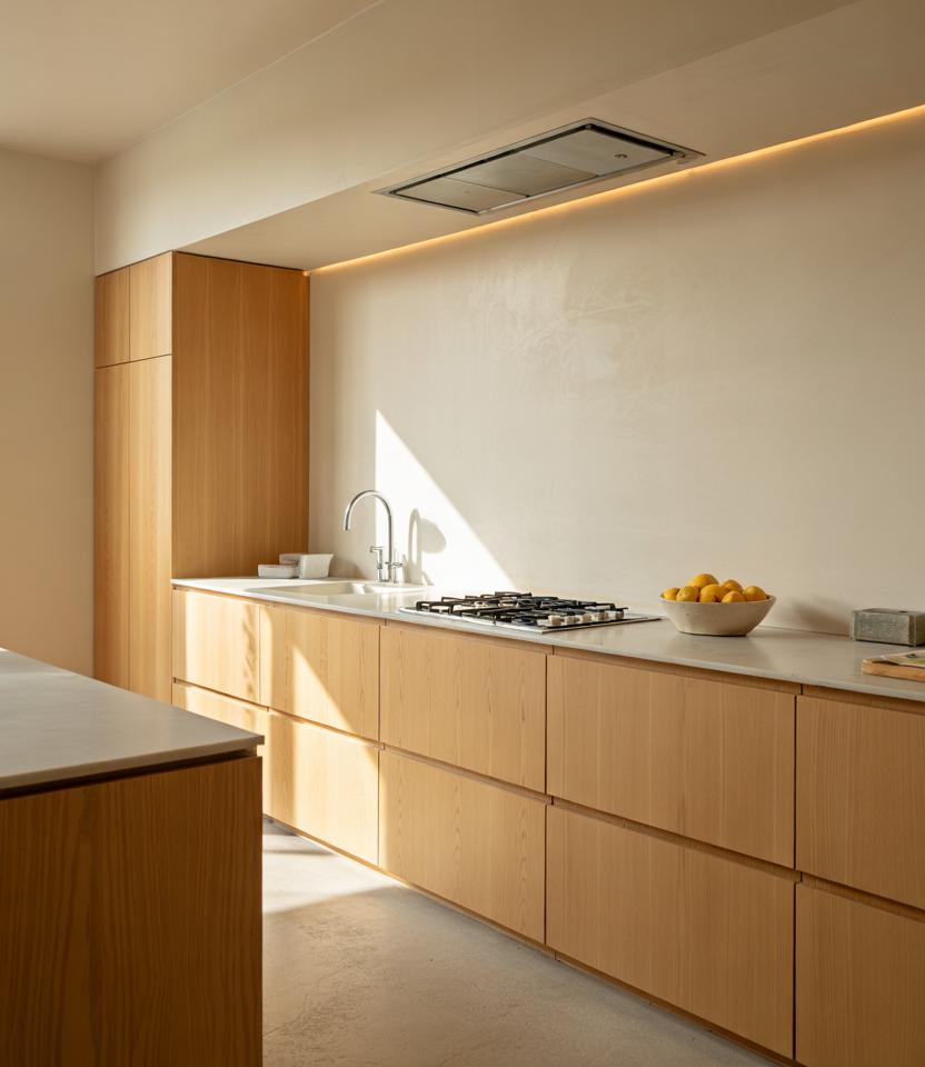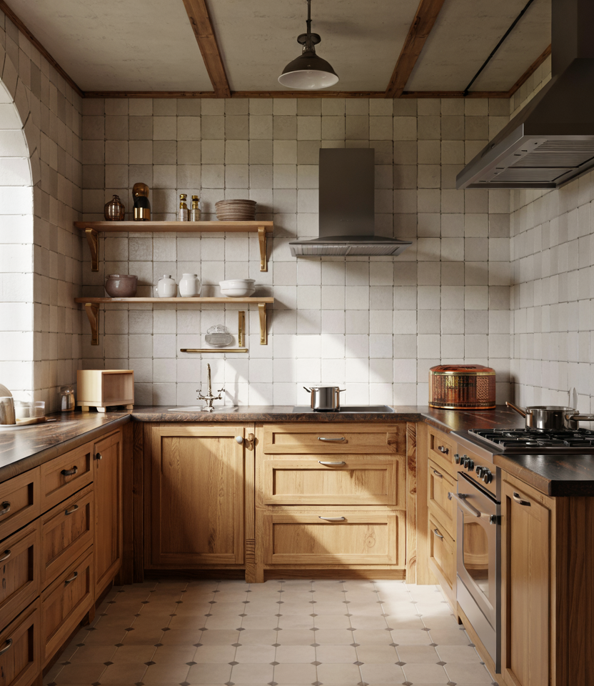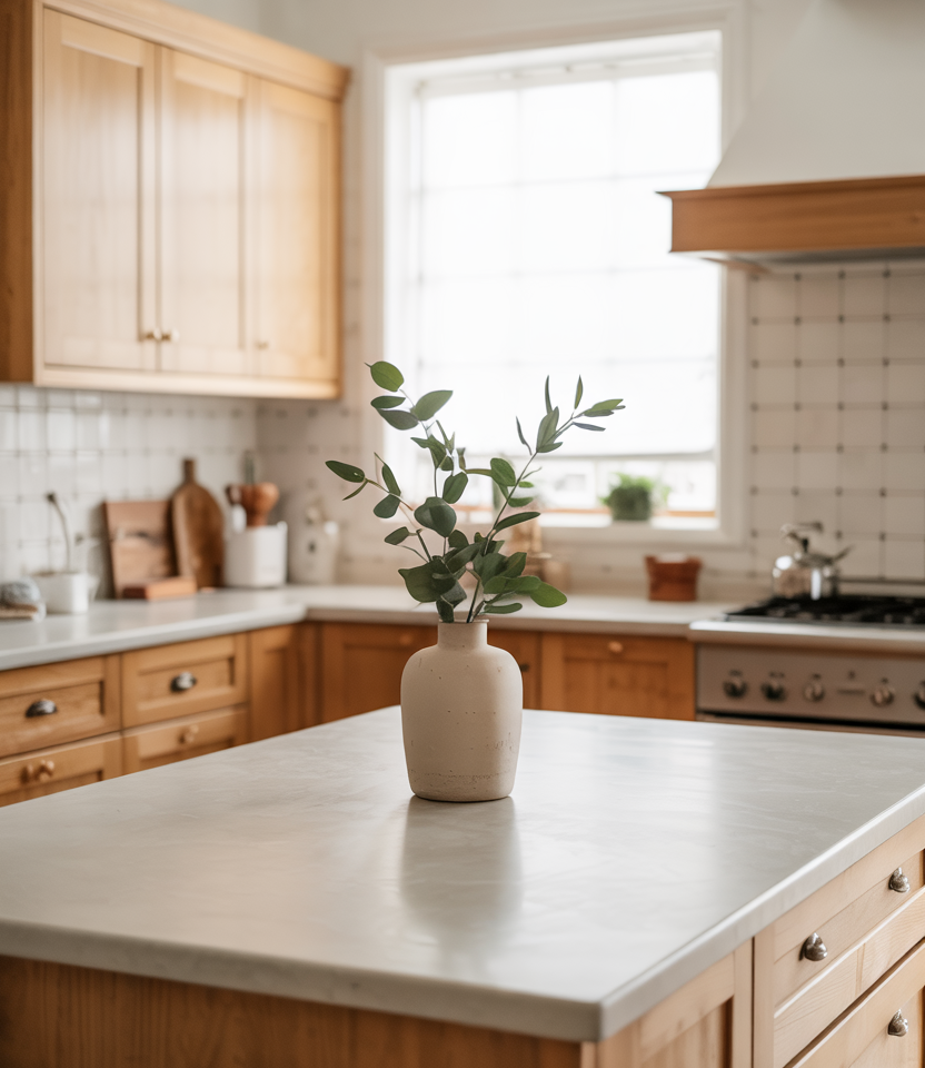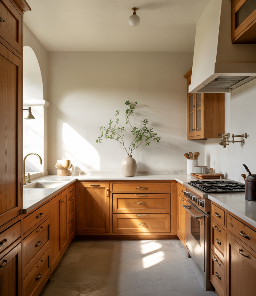 The combination of oak warmth with gentle cool tones feels especially current. Pairing a soft grey floor, slim hardware ideas, and a balanced natural finish on cabinets produces a welcoming kitchen that feels fresh but not trendy.