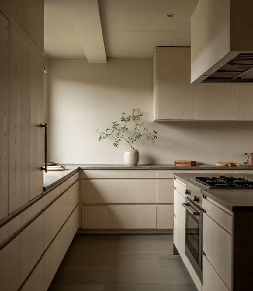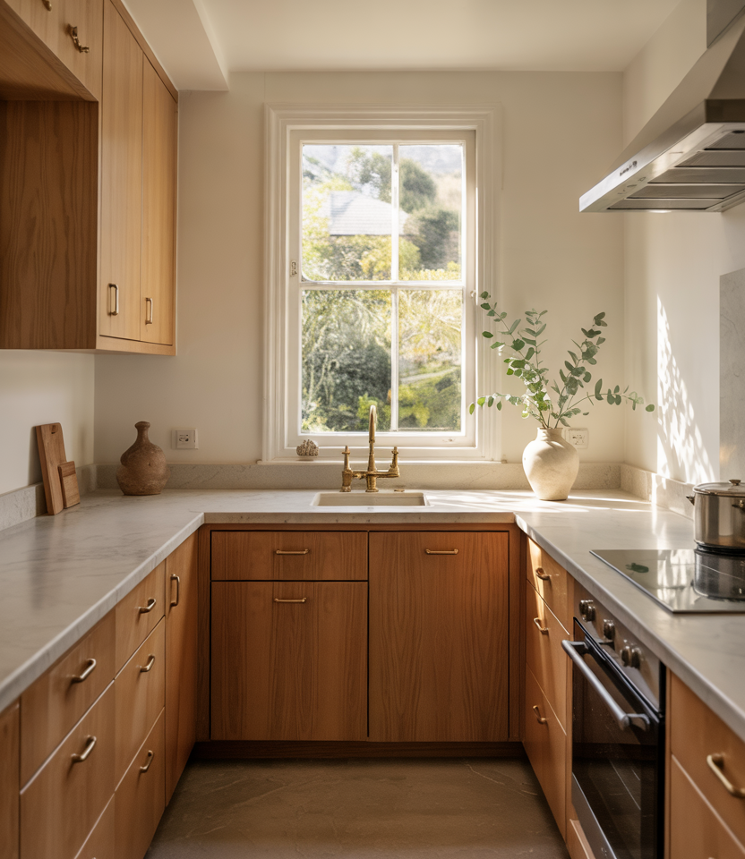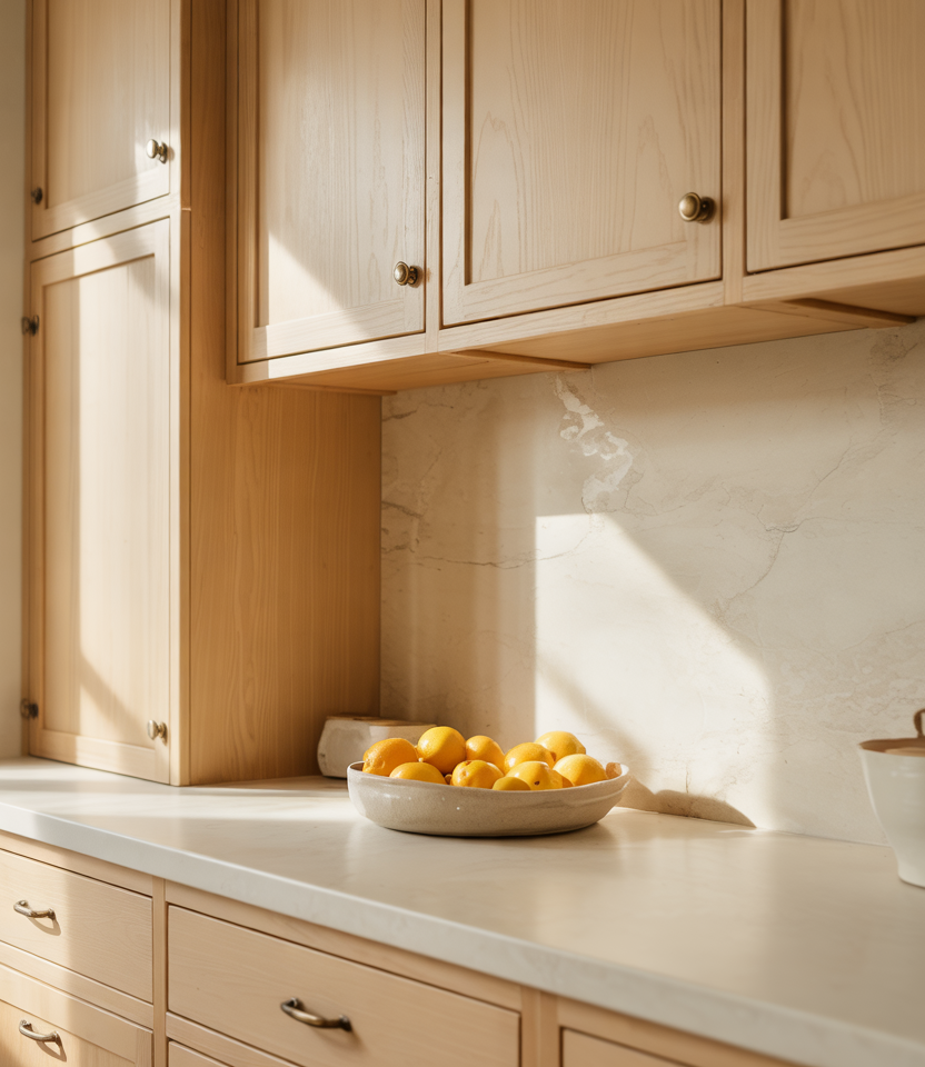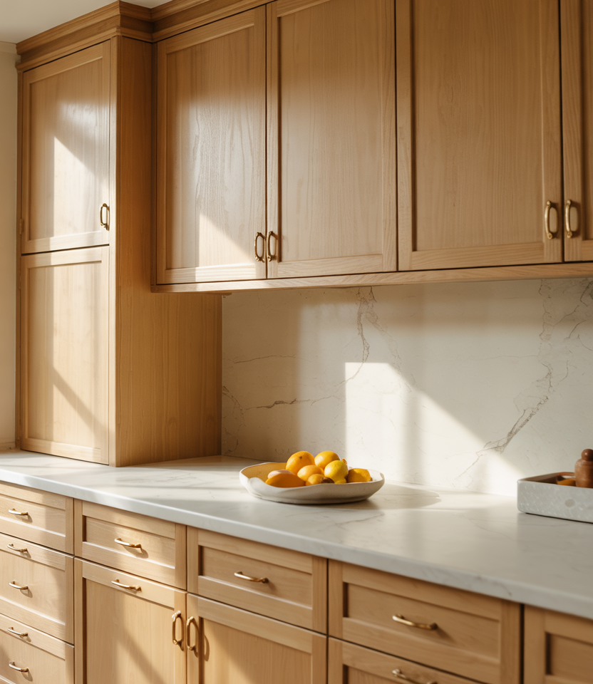 Small kitchens benefit from materials that bring warmth without making the space feel heavy. White oak with a gentle natural tone, subtle finish options, and efficient hardware ideas creates a layered look that feels intentional, not overcrowded.