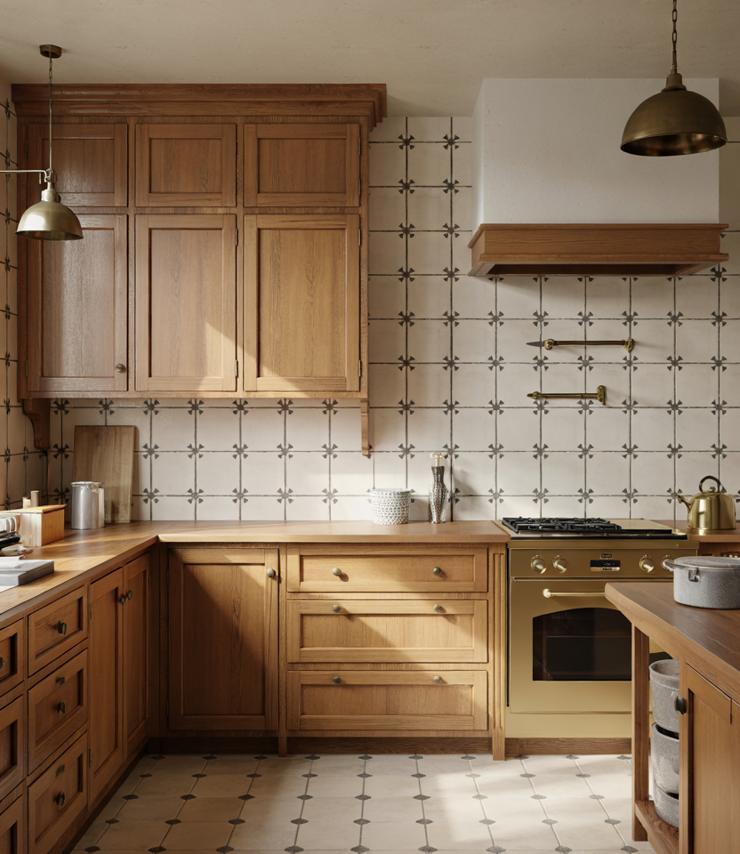 A patterned tile backsplash offers personality without overwhelming oak cabinetry. Pairing white oak with earthy terracotta floor undertones, polished brass hardware, or cooler grey floor contrasts gives the pattern room to shine without clashing.