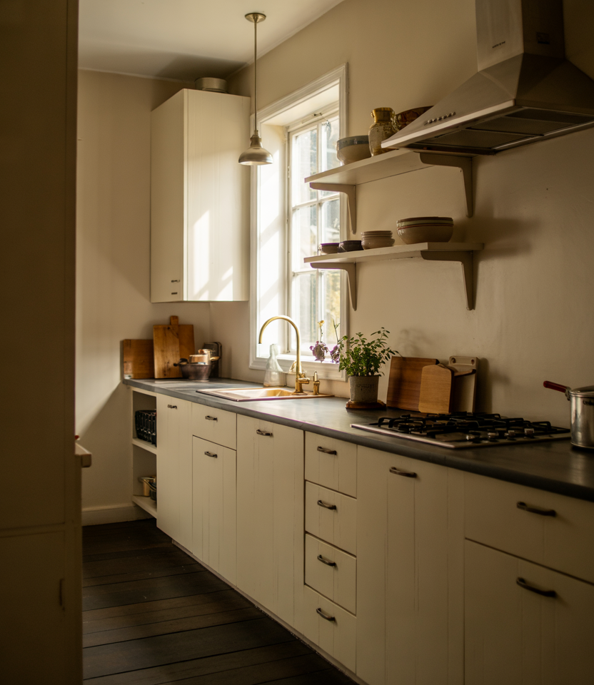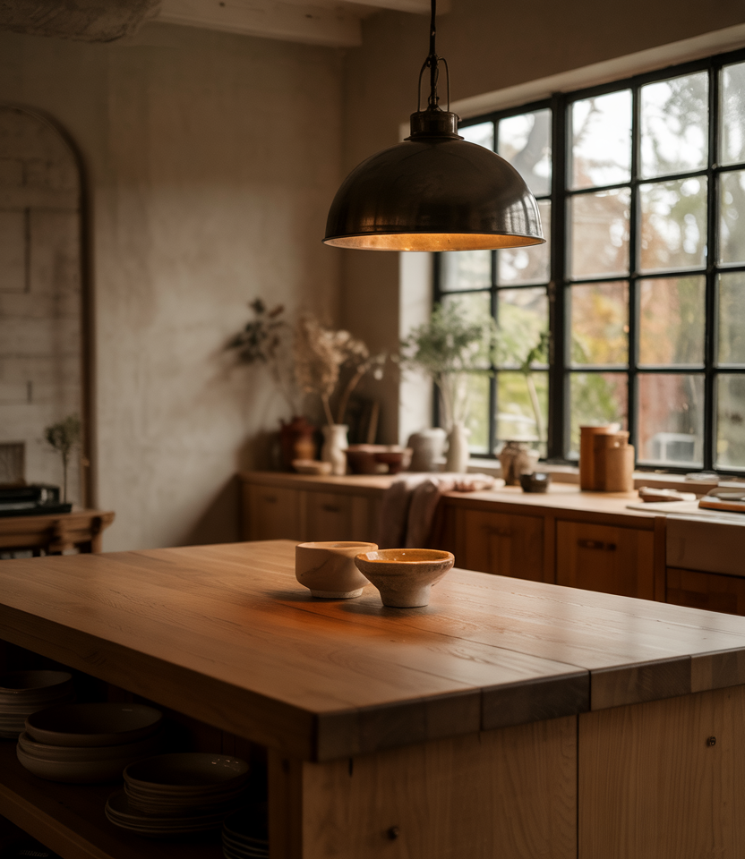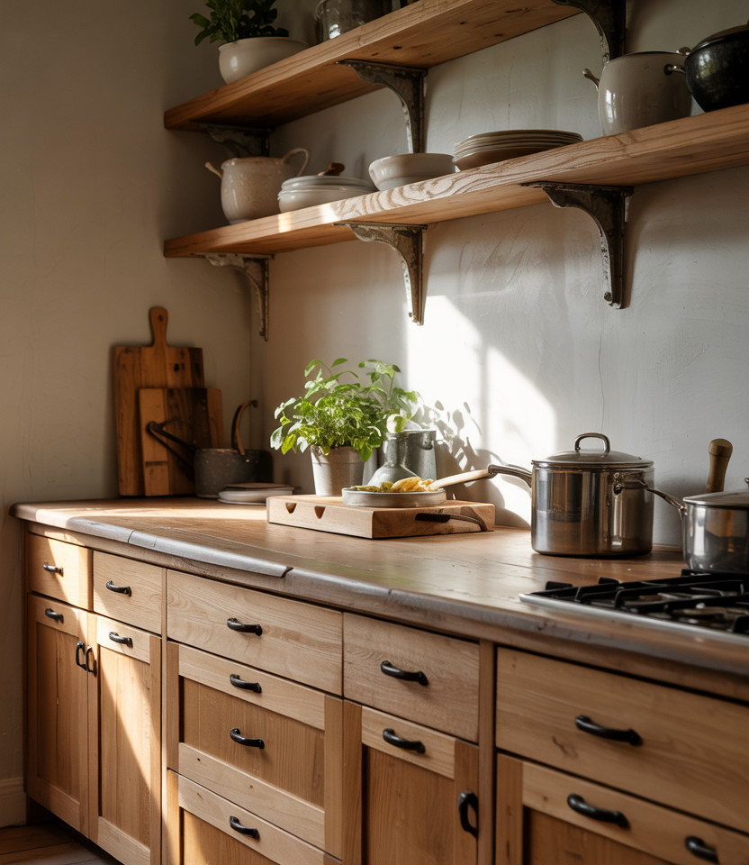White oak’s gentle grain balances beautifully with deeper accents. Pairing it with a touch of black and muted metallics like gold hardware or the soft patina of rustic finishes gives the kitchen quiet drama without veering into harsh contrasts.