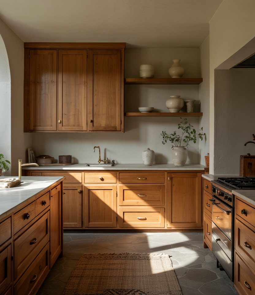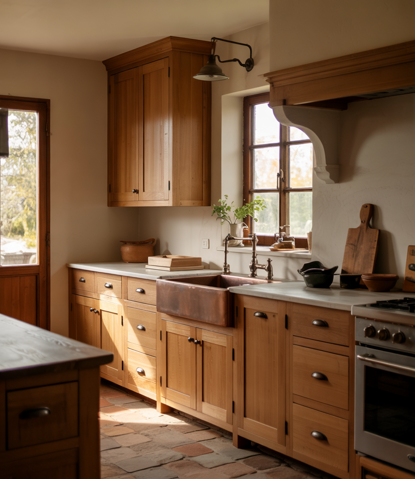 If you’re aiming for a modern farmhouse aesthetic, a slightly rustic oak grain paired with rich dark counters and matte black hardware brings a grounded charm. Incorporating touches of terracotta floor warmth keeps the space honest and welcoming.