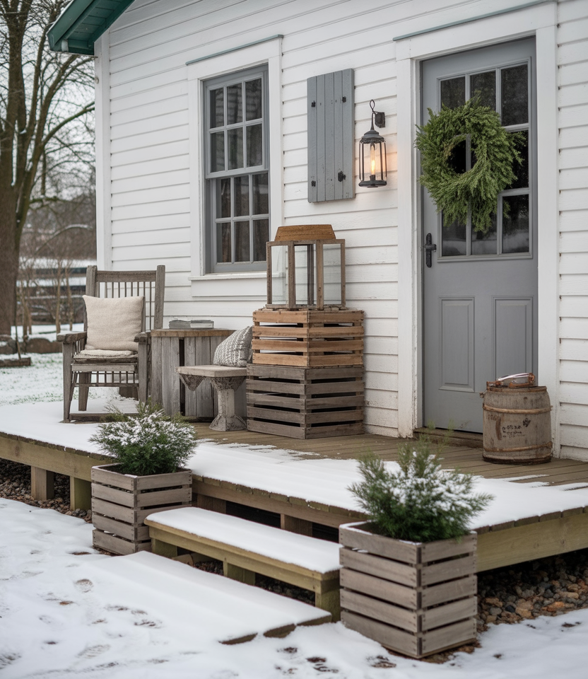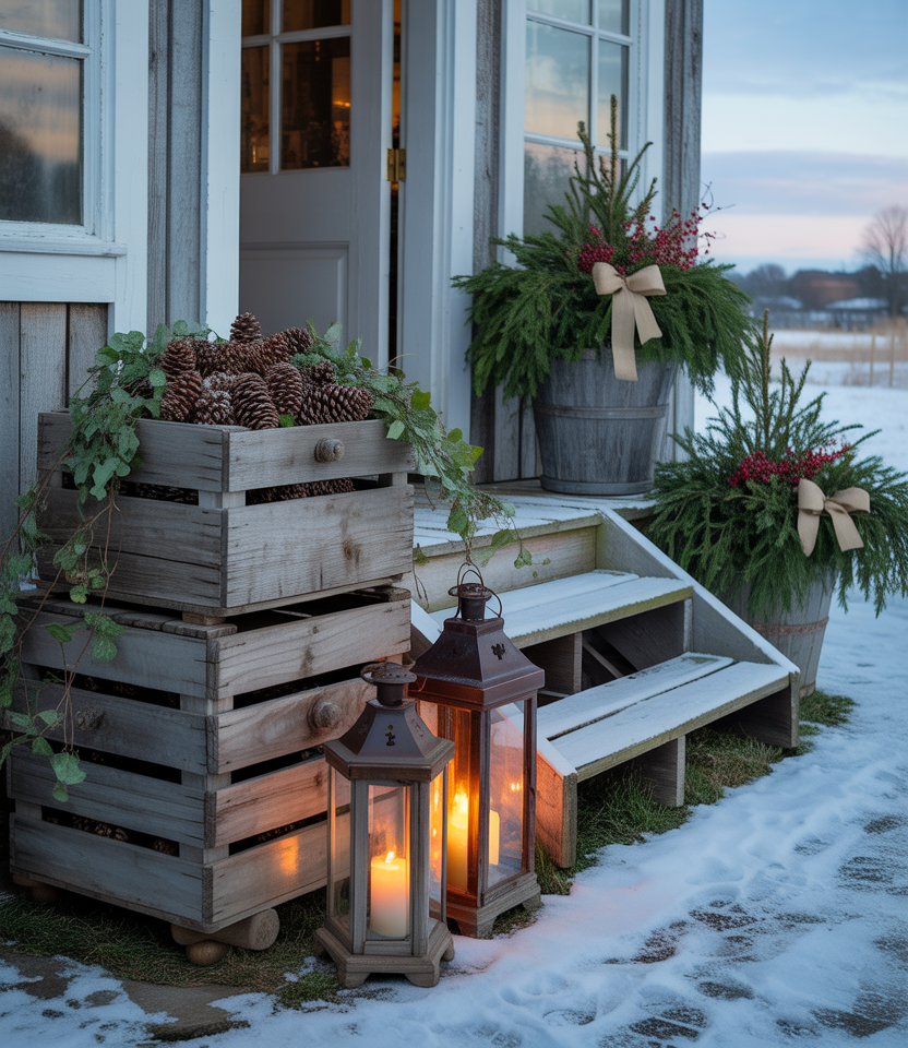 Wooden crates impart rustic charmand double as display stands for Christmas pots planters or stacked blankets. This works well for ideas after Christmas, giving an easy-going yet cozy farmhouse feel. I have flipped crates vertically to hold lanterns in January, and it soon became a focal point for conversation. A DIY twist is to paint or stain crates to match your porch tones.