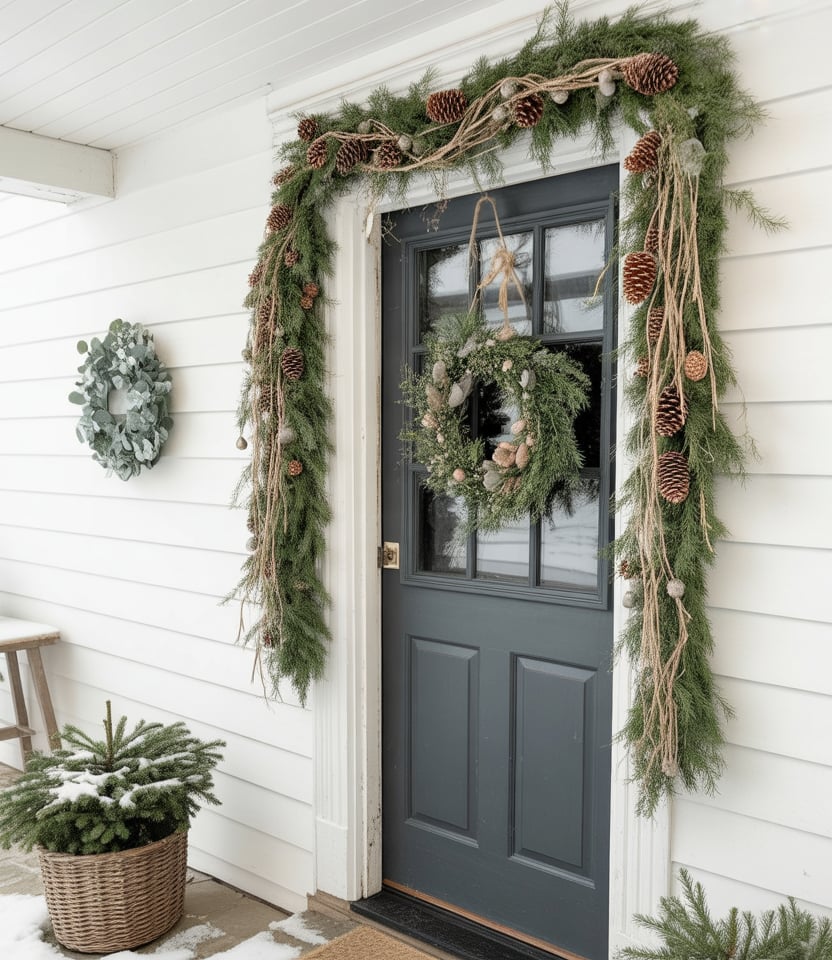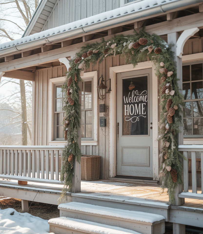 Garlands aren’t just for Christmas front doors. Switch bows for twine and pinecones to make them not Christmas, perfect for late January charm. Designers like The Nester often highlight garlands as transitional décor that keeps porches cozy without looking holiday-specific.