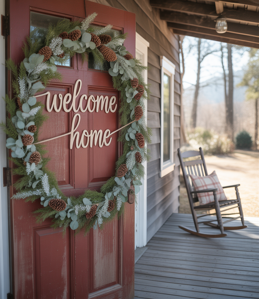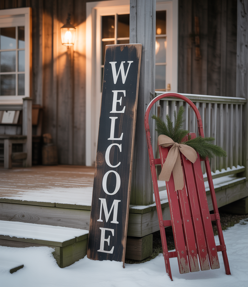 A tall wooden welcome sign is both rustic and timeless, perfect forideafarmhouse porches. Swap out Christmas motifs for the neutrality that keeps the charm after Christmas and solidly into January. I painted mine as a diy project last year and guests are always commenting on its cozy personality.