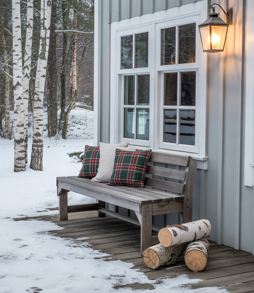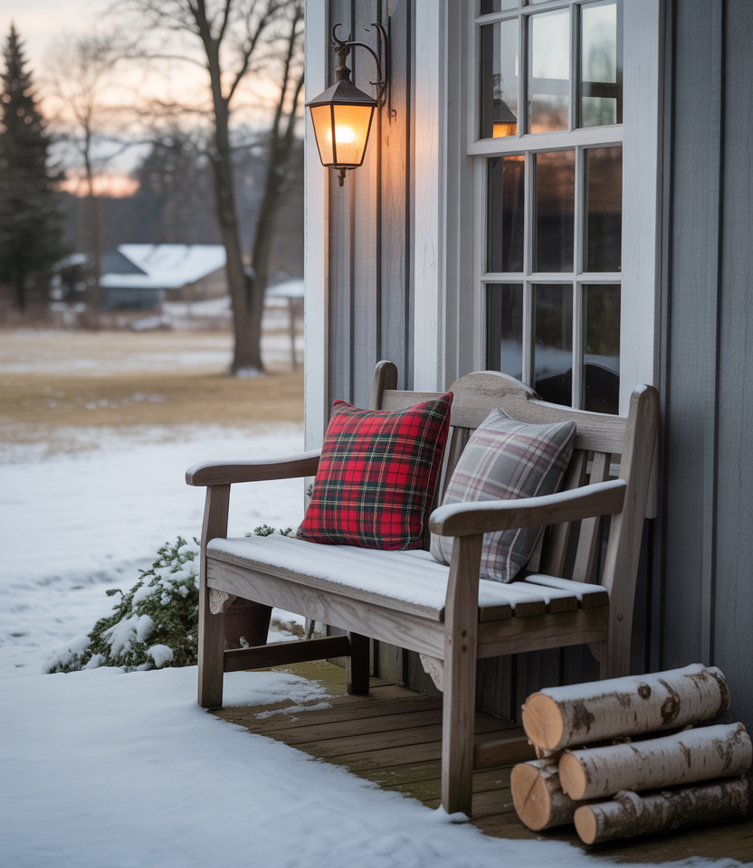 A wooden bench on the porch is practical and decorative, fitting perfectly in ideas farmhouse styling. Dress it with plaid pillows or birch logs for rustic outdoor ideas after Christmas. This is a simple diy setup I use every year, especially in January, when the space feels too bare after the holiday décor is gone.