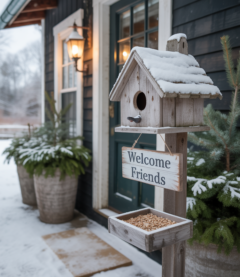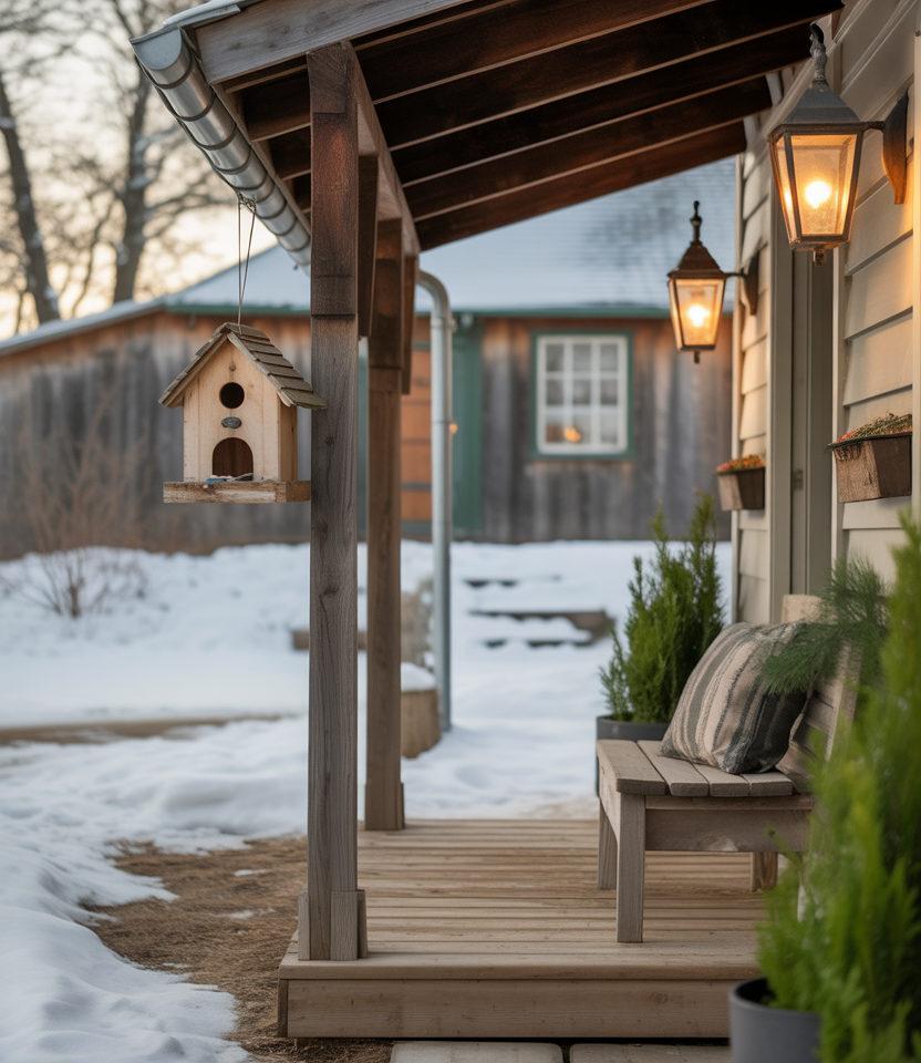 Decorating with birdhouses or feeders is charming and functional. These outdoor ideas after Christmas bring life to the porch, attracting winter birds. In ideas farmhouse styling, wooden birdhouses feel perfectly rustic. I love hearing chickadees right outside the door—it makes January mornings brighter.