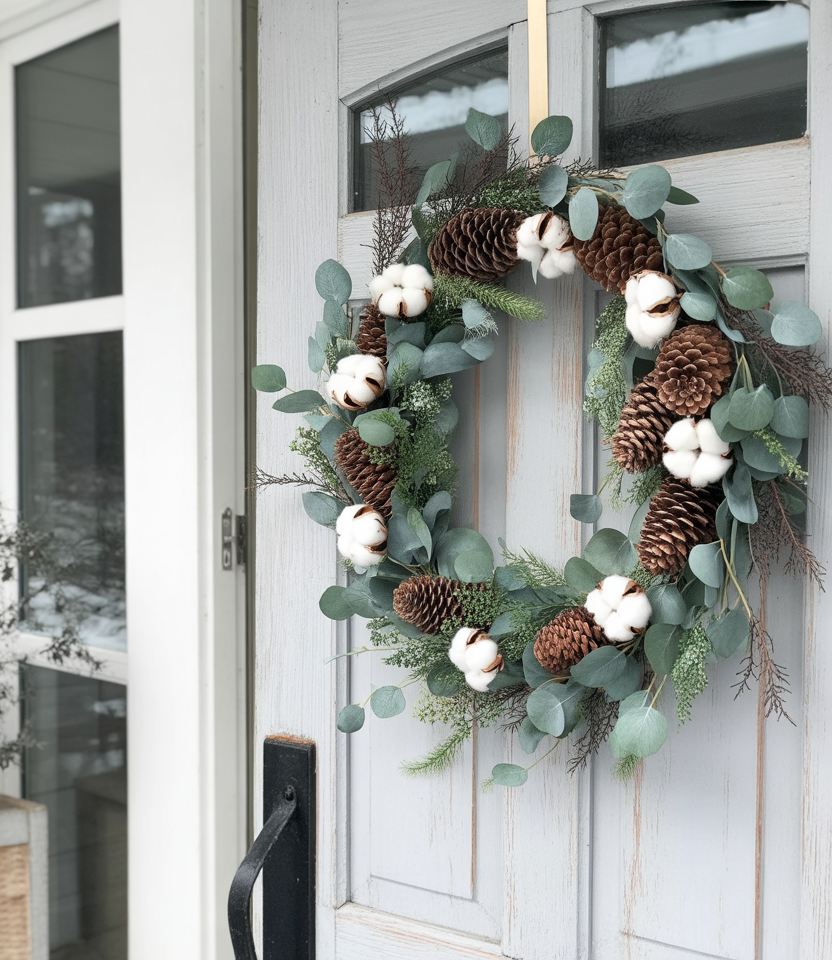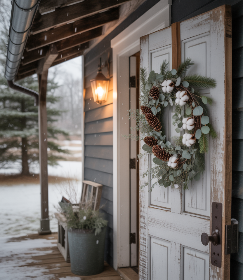 A wreath need not scream Christmas off front doors. Swap out red bows for natural pinecones, eucalyptus, or cotton stems for an easy farmhouse look. These wreaths are for sure not Christmas-They drift well into January and February. One time I put dried orange slices on mine, and my guests commented that it smelled like winter tea-an unexpected yet delightful surprise!