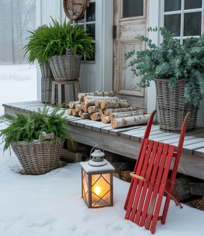 Fill wicker baskets with pine branches, dried hydrangeas, or birch logs for outdoor ideas after Christmas. This simple diy works especially well in ideas farmhouse setups. I’ve placed mine right beside a sled for added rustic charm in January.