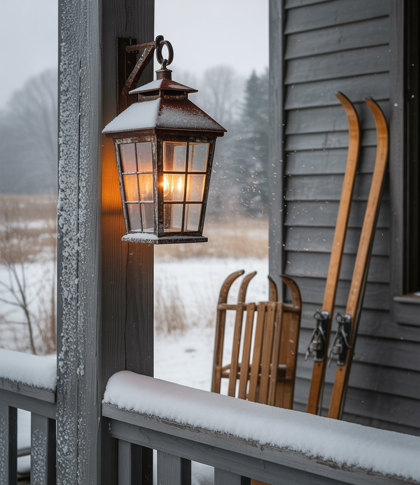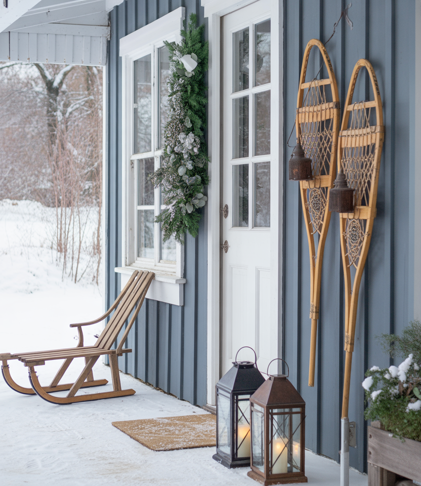 Vintage snowshoes rival skis for porch décor. Hung on the wall, they’re a rustic outdoor idea after Christmas and make a charming January display. I spotted this idea in Country Living magazine and immediately adopted it—guests always smile at the nostalgic touch.