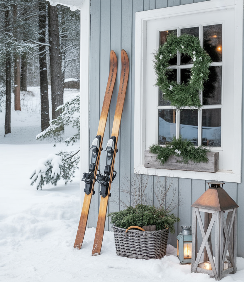 Vintage skis are the beloved porch decoration. Leaning them against a wall gives that cozy alpine lodge feeling, suited for outdoor ideas after christmas. Pairing it with some greenery makes the porch festive but not Christmas—really, it’s all about those winter sports vibes. I have seen designers such as Liz Marie Galvan using them in farmhouse style hanging with a little wink. It works even in January well after all the Christmas décor has been put away.