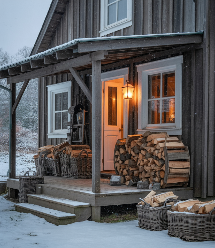 Stacking firewood on the porch looks utilitarian but if styled well, it’s a rustic outdoor idea that adds warmth after Christmas. When matched with baskets, plaid cloths, or tin buckets, it forms a large part of the porch aesthetic. Personally, I love this look in January — it feels natural and practical, especially when we’re constantly having fires.